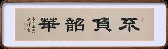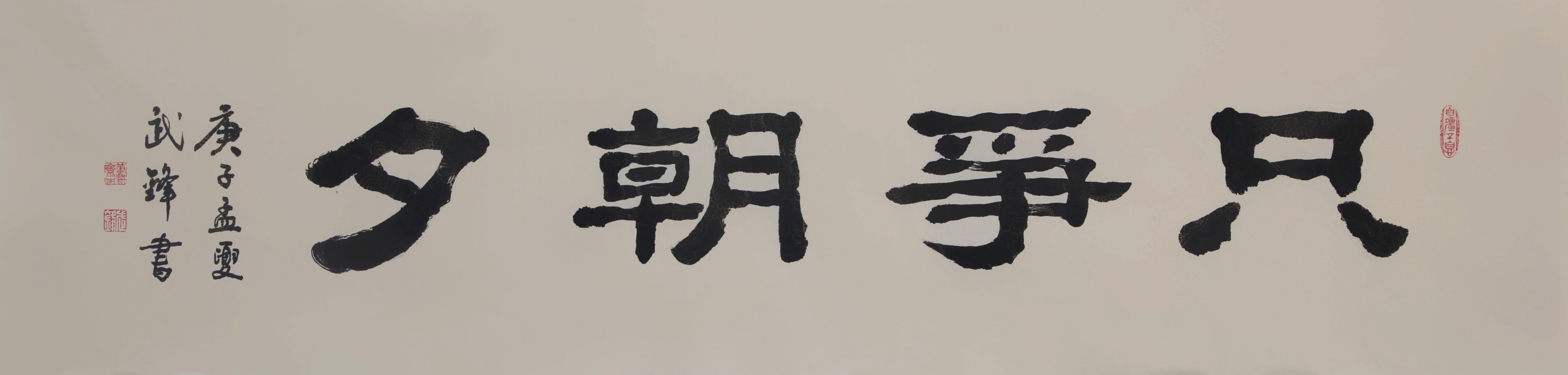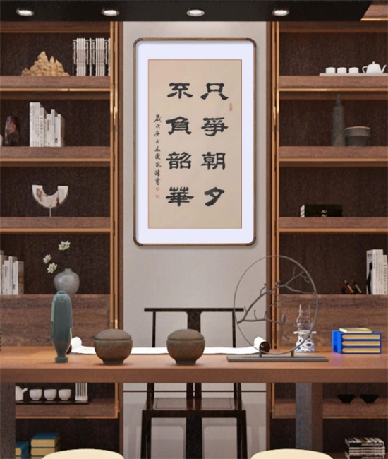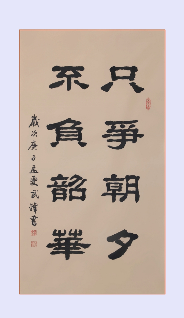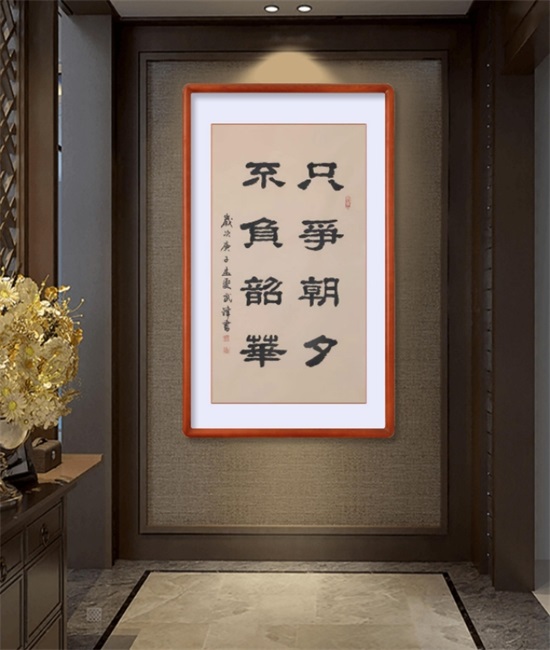 本书法采用仿古宣纸书写,尺幅为95X53厘米。同时,还把“只争朝夕”和“不负韶华”作为两幅单独的书法,用四尺条仿古描龙宣纸书写了一遍。现一并发出来,就像母亲带着她的一对“龙凤胎”一起亮相一样!