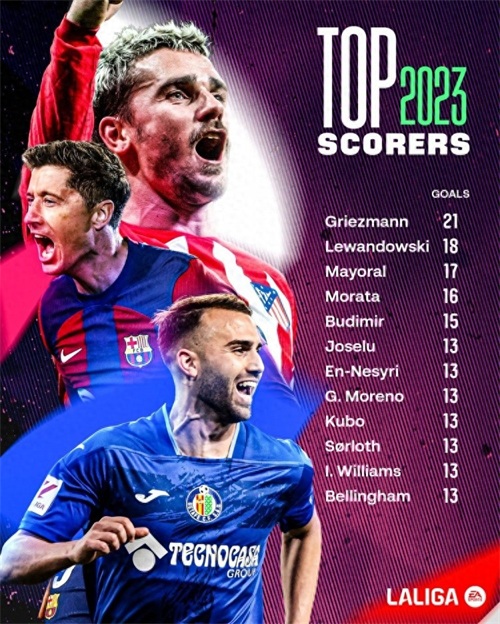 直播吧12月28日讯 西甲官方列出2023年联赛射手榜,格列兹曼以21球居首,莱万打进18球排名次席,今夏加盟皇马的贝林厄姆以13球排在并列第6位。