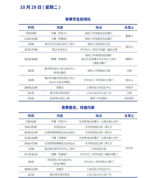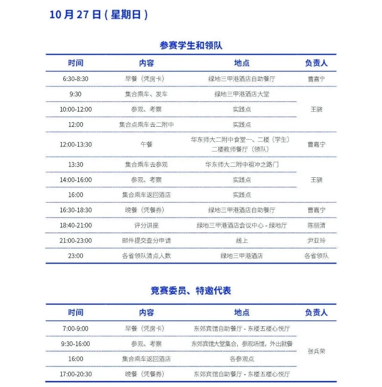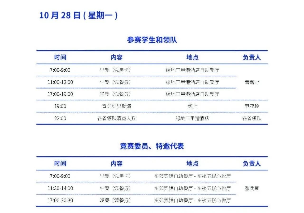 根据日程安排,今日13:00-22:00为报到时间;10月26日为考试日,早上9:00-12:00进行理论考试,下午15:00-16:00进行实验考试;10月27日晚上21:00-23:00可进行查分申请;10月29日晚上19:00-21:00进行闭幕式。