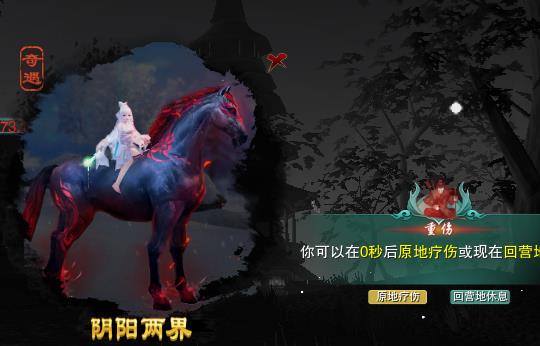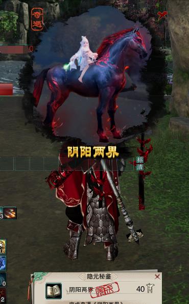 奇遇名称:阴阳两界前置条件:资历3w+(越高越好)触发方式:各种死法(摔死或者被打死)奇遇奖励:背部挂件(阴阳剑)坐骑(霸红尘)称号(缘定阴阳)