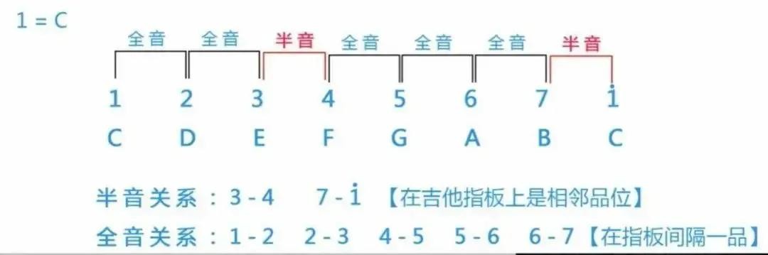 Do-Re是全音关系,Re-Mi是全音关系,Mi-Fa是半音关系,Fa-Sol是全音关系,Sol-La是全音关系,La-Si是全音关系,Si-C是半音关系。