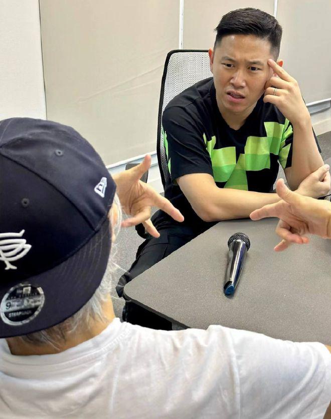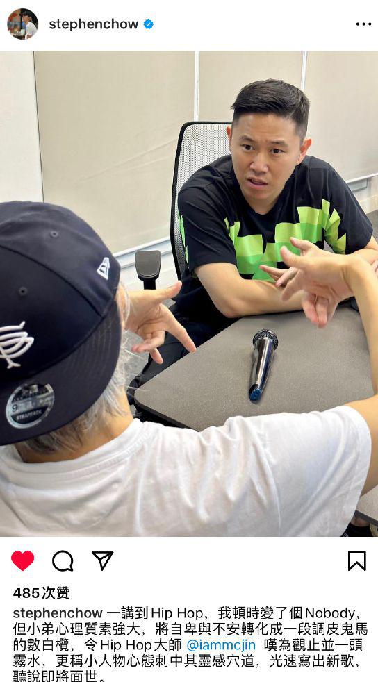周星驰在自己的 ins 账号晒出了他跟著名说唱歌手欧阳靖的合照,并配文表示他跟 hiphop 大师欧阳靖合作写新歌,听说即将面世,并艾特了欧阳靖的账号。在照片中可以看到周星驰背对着镜头,他依旧穿着白色短袖 T 恤,戴着黑色棒球帽,面对着欧阳靖做出嘻哈的手势,而欧阳靖似乎一头雾水的样子。