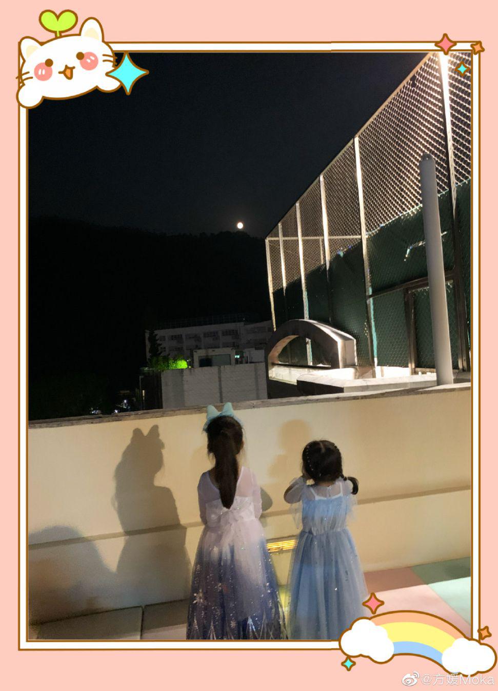 方媛还晒出了两个女儿的背影照,姐妹俩穿着公主裙赏月,画面也太有爱了吧。