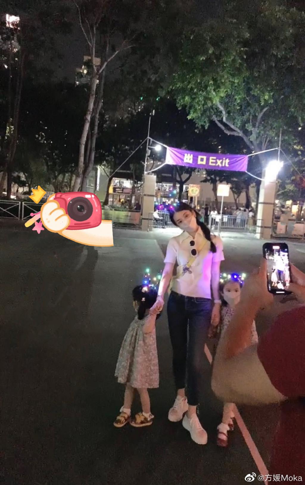 出门游玩拍照是少不了的。方媛拉着两个女儿,面对镜头摆着姿势。郭富城在一旁化身工具人拍照,记录下妻女的美好画面。