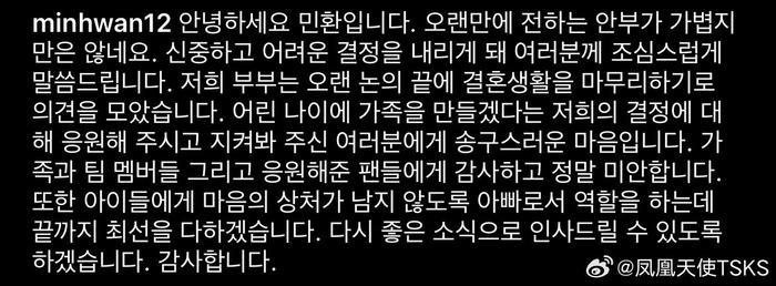 对家人、成员还有支持我的粉丝们,真的非常感谢又很抱歉。 另外,为了不让孩子们留下心灵上的创伤,我会尽最大努力扮演爸爸的角色。 会再带着好消息和大家见面的。谢谢。