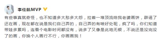 近日,李佳航在微博上发文疑似回应“网传李晟出演《传闻中的陈芊芊2》”和“出演翻拍韩剧《经常请吃饭的漂亮姐姐》”一事:“有些事真就奇怪,也不知道多大愁多大怨,拉着一堆顶流给我老婆画饼,辟谣了还在画,现在都在说是我们自己弄的,自己弄的有啥好处呢,疯了吗,你们知道带娃多累吗,连看个电影时间都没有,说多了又像是此地无银,不说还是没完没了的画,你换个人画行不行,你画画我! ”