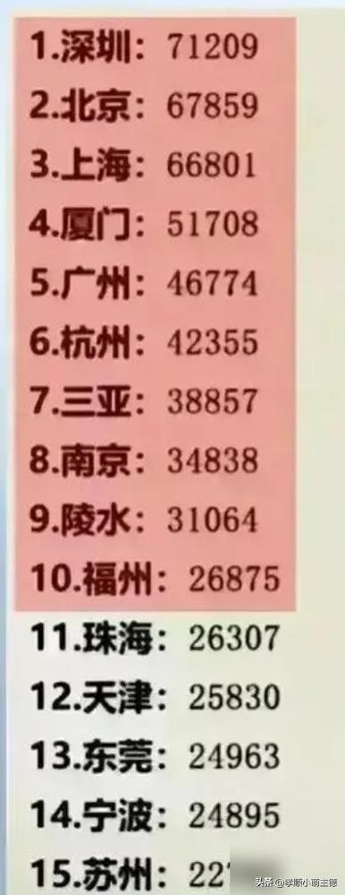 在前30名中,除了北京、上海和深圳外,还有广州、杭州、成都、重庆、三亚、厦门、南京、深圳、福州、珠海、苏州、东莞、长沙、天津、青岛、温州、黑龙江、宁波、哈尔滨、绍兴、贵阳、西安、济南以及昆明等24座城市。