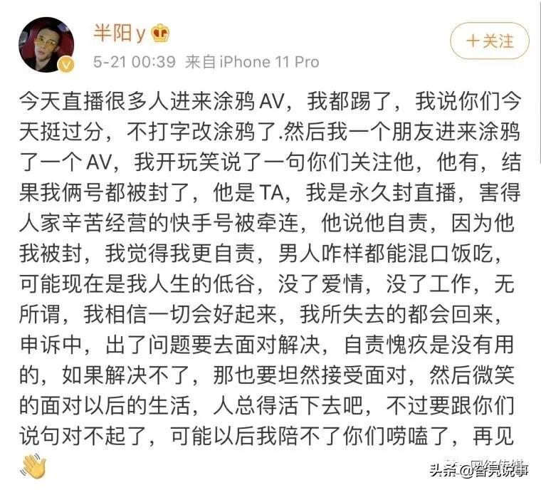 在粉丝还一脸懵逼的时候,凌晨半阳发文解释了账号被封一事,原来是半阳在昨晚直播的时候,很多人(打广告的)在公屏涂鸦“AV”,自己就吐槽了一句“今天挺过分,不打字都改成涂鸦了”。