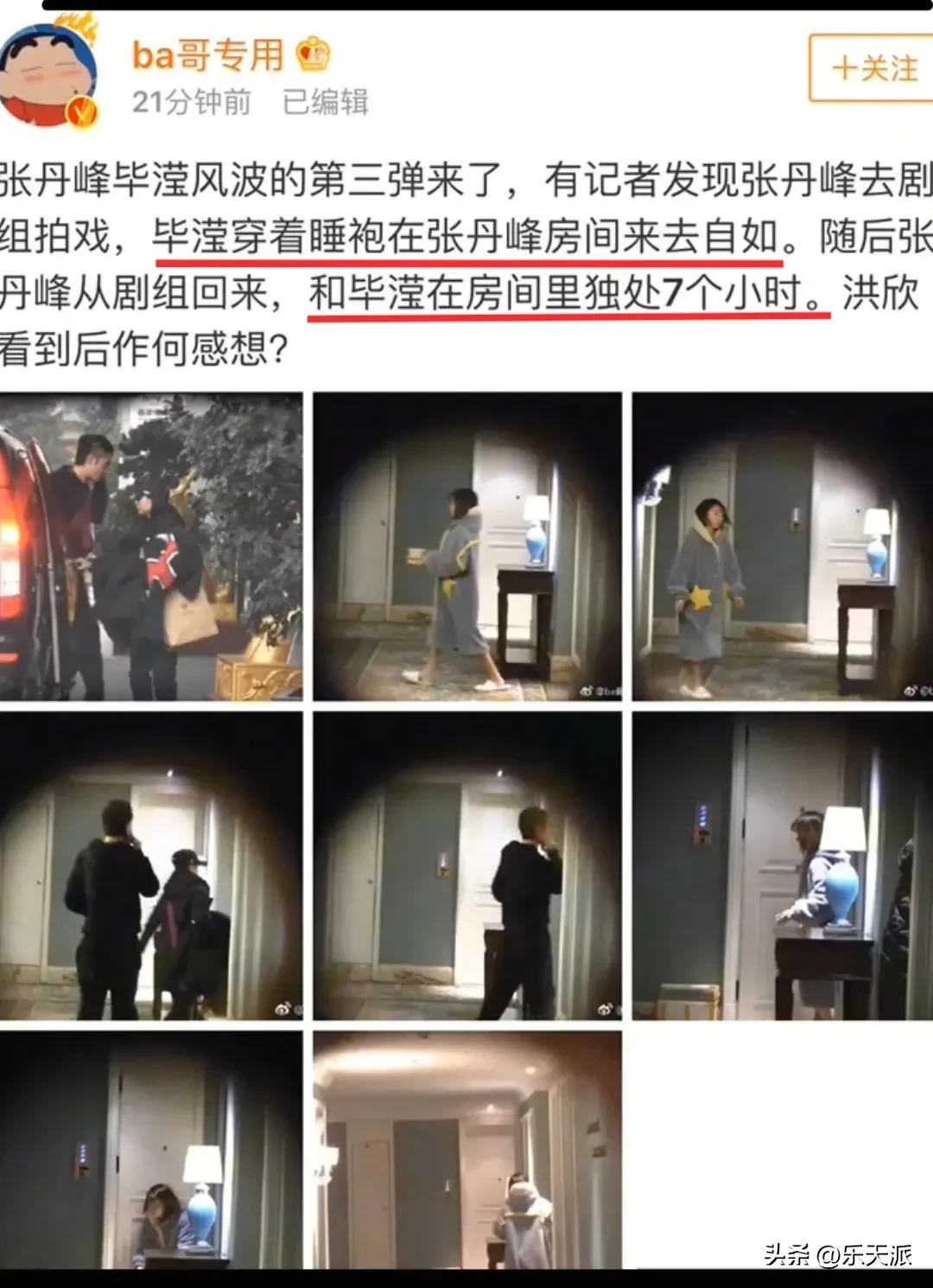 当年的“婚变”传闻,一是有狗仔拍到,张丹峰的经纪人毕滢穿着睡衣,与张丹峰在房间内单独相处了7个小时。