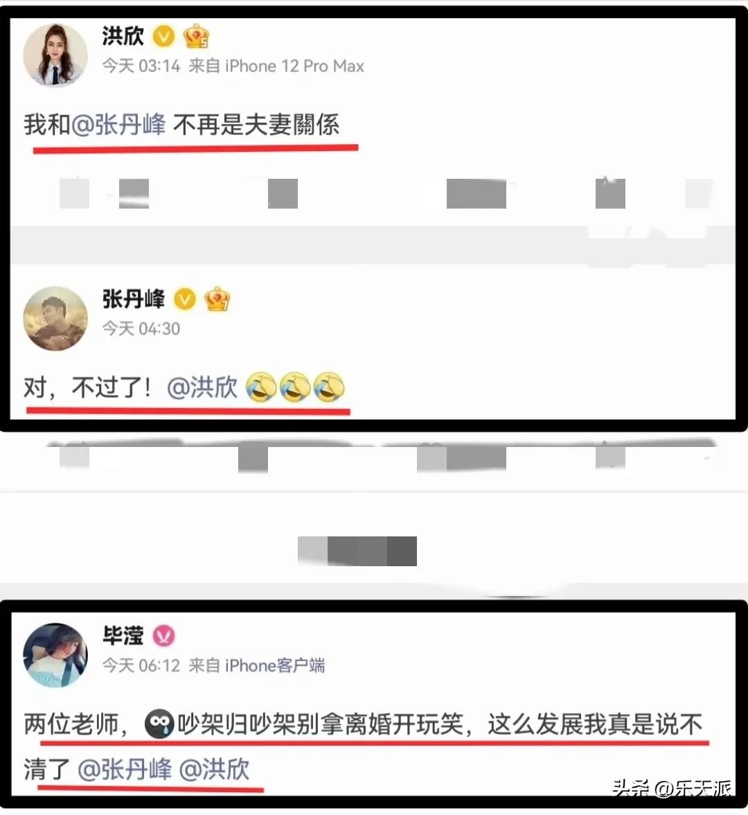 这场传闻中,最实锤的是洪欣、张丹峰、毕滢三人下场发文。
