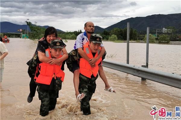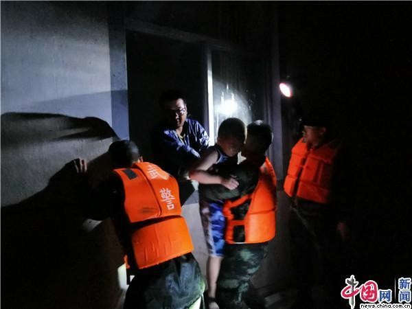 武警台州支队官兵在临海市永丰镇转移受内涝围困的群众。