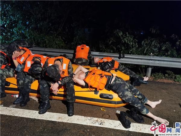 连续奋战10多个小时后,武警官兵们躺在舟艇上休息“充电”。