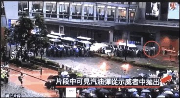 从真实视频画面,可以清楚地看到,汽油弹是由示威者掷向警方防线的!但最终的片段却被恶意删改成汽油弹由警方防线丢向示威者。