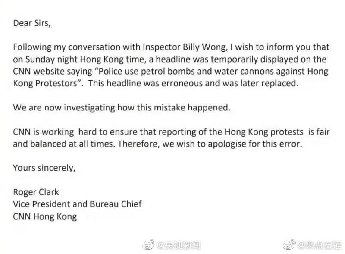 近日网上流传一段经恶意删改指控香港警方使用汽油弹的视频。8月28日下午,例行记者会上,香港警方澄清网传视频纯属谣传,而做不实报道的CNN已经道歉,道歉信全文被公布。