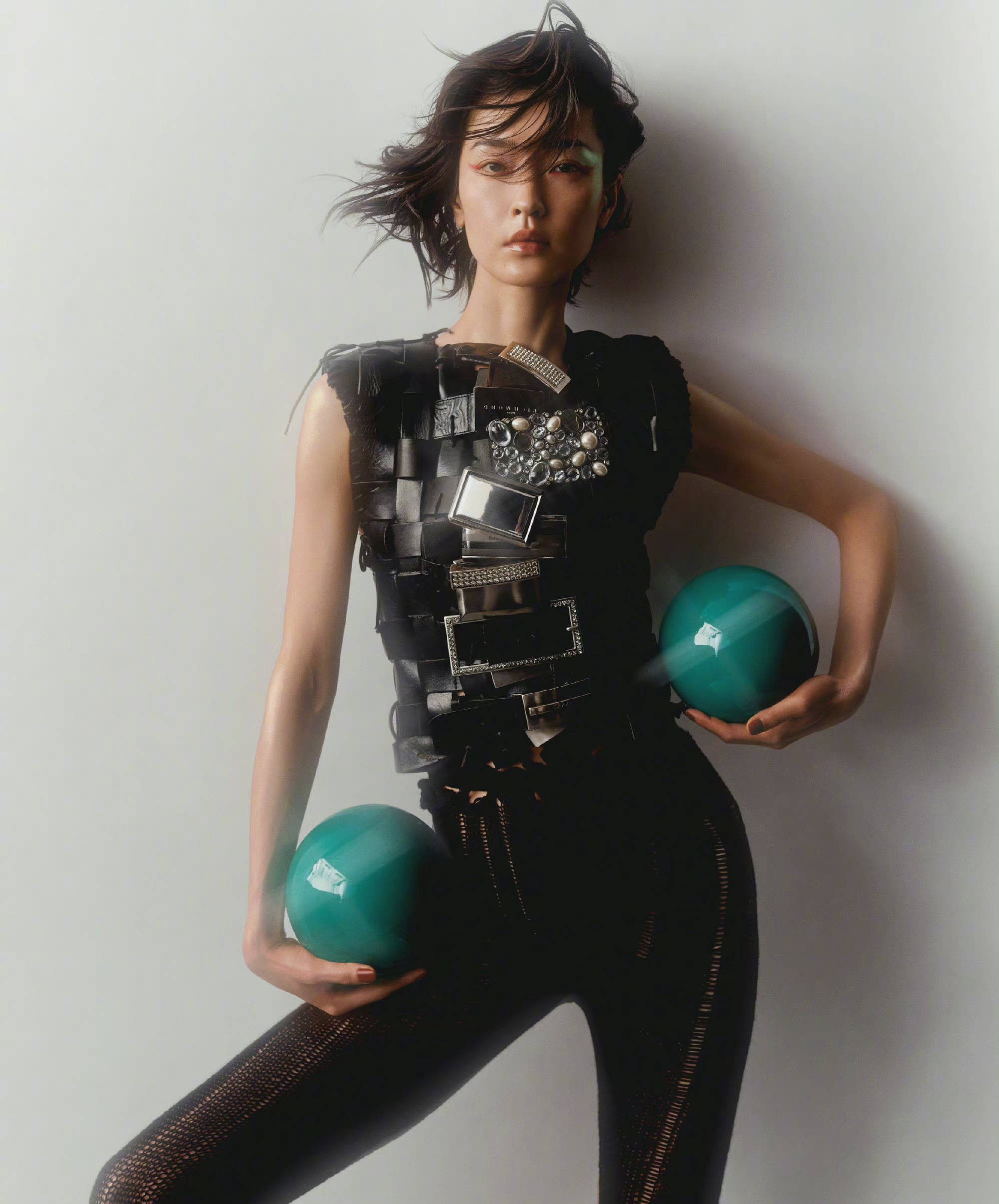 杜鹃一身黑衣手拿两个瑜伽球,运动感十足。