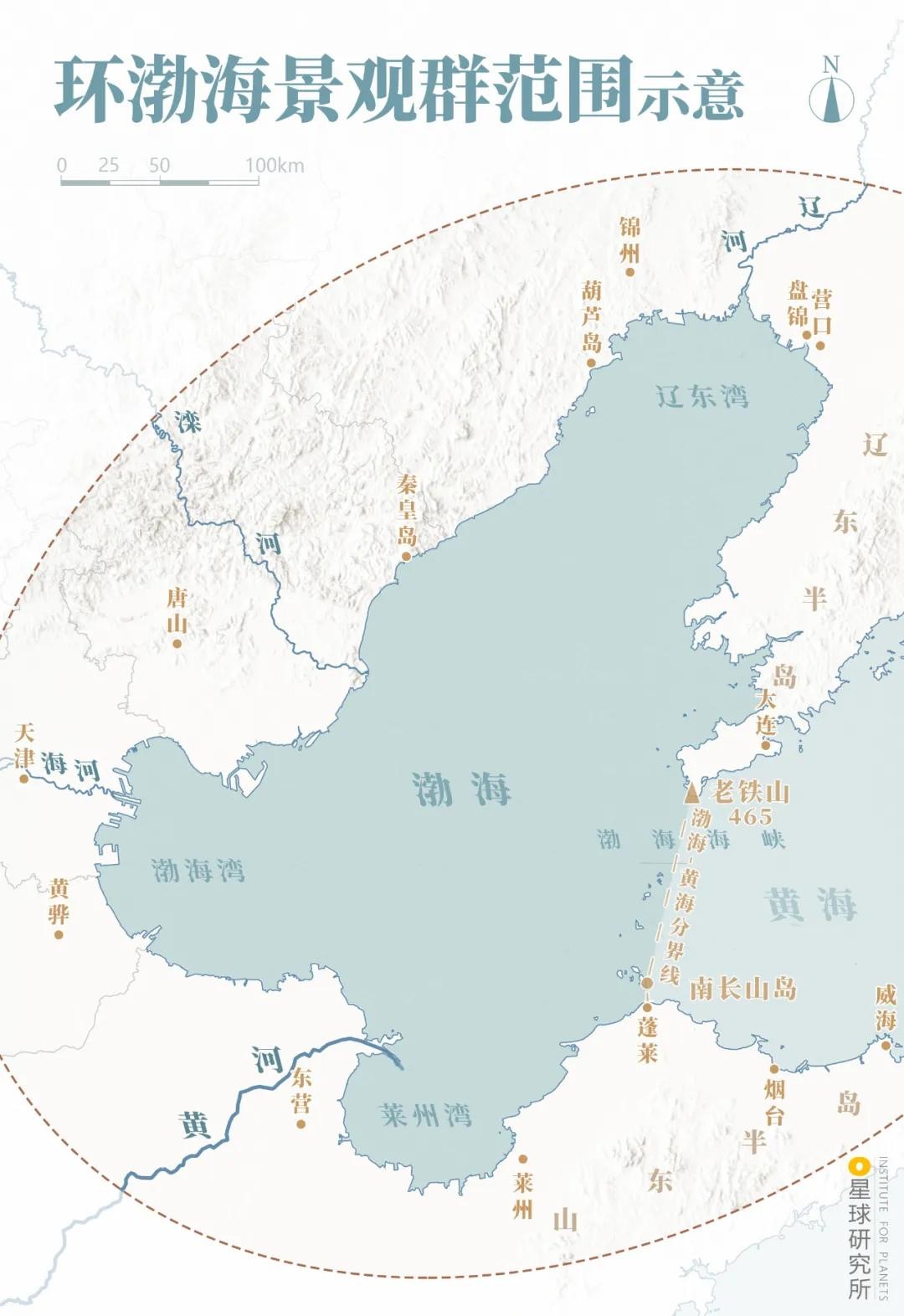 环渤海景观群范围示意,以渤海海域为核心,同时也包含辽东半岛东部、山东半岛东北部紧邻黄渤海分界线的部分黄海景观。