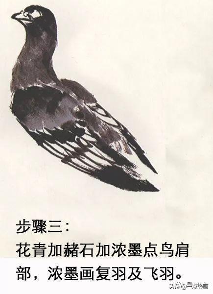 步骤三:花青加赭石加浓墨点鸟肩部,浓墨画复羽及飞羽。