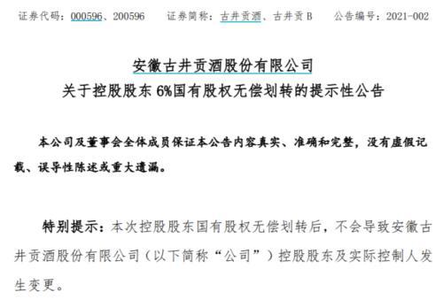 1月15日晚间,古井贡酒(000596)发布关于控股股东6%国有股权无偿划转的提示性公告。
