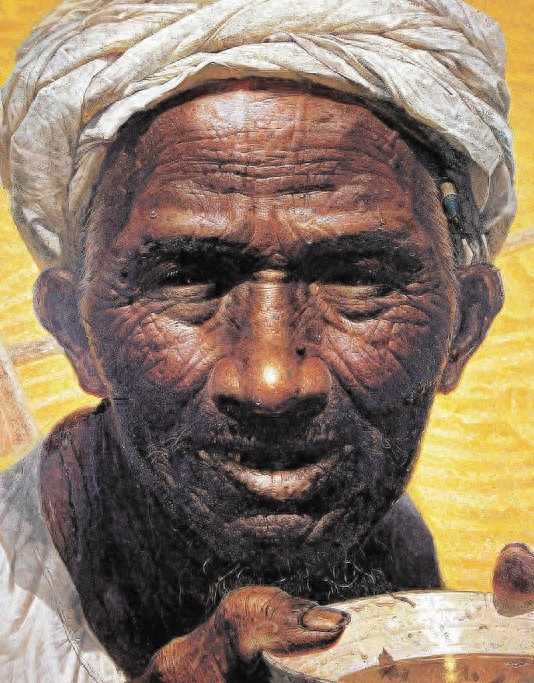 干裂、焦灼的嘴唇似乎已被封干许久,仅剩一颗门牙的嘴里不知饱尝过多少的酸、甜、苦、辣,犹如耙犁一般的破伤的大手捧着一个破了又被重新锔起的粗瓷碗在喝水,细小毛孔里渗出的汗珠不知已滑落多少,稀疏的胡须,还有那象征着悲剧色彩的苦命痣,都无不打上了他艰苦劳动,生活悲惨的的烙印。