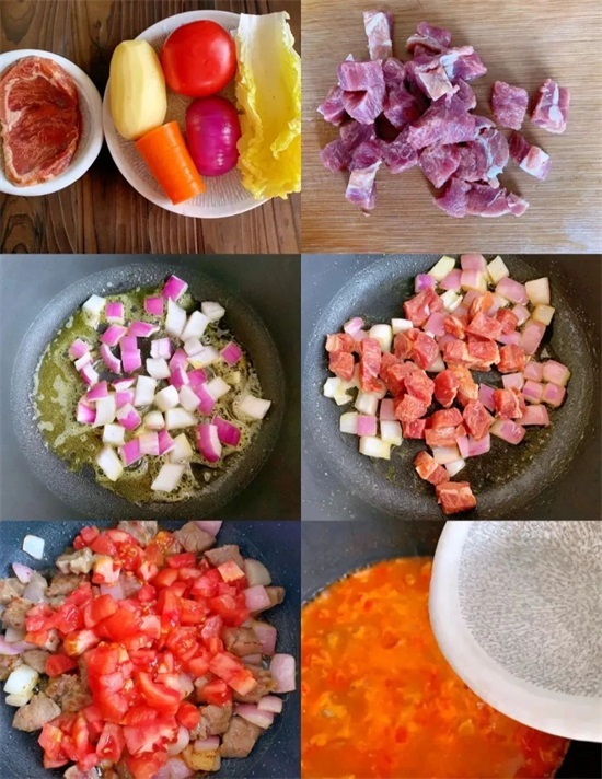 黄油放入锅中加热后,放入洋葱丁爆香,倒入牛肉快速翻炒至变色,再放入番茄大火炒出汤汁,加入适量的清水煮开。