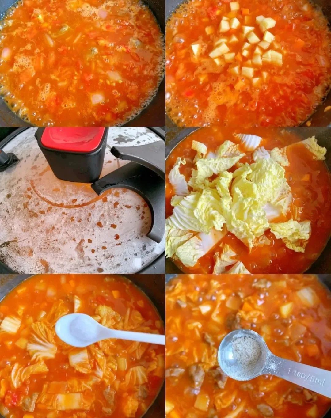 接着放入黄萝卜丁和土豆丁,盖上锅盖中火煮10分钟,放入娃娃菜再煮5分钟,出锅前加入适量的盐和少许胡椒粉搅拌均匀盛出即可。