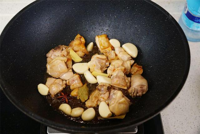 3、起锅配菜烧油,鸡胸肉丝怎么炒好吃,加入一勺白糖炒出糖色配菜后肉丁减肥,倒入鸡块、姜片、大蒜肉丝、香叶、八角做好,翻炒均匀使鸡块裹上糖色。