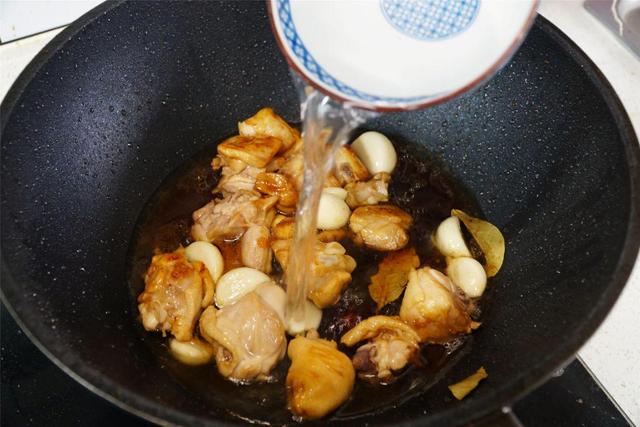 4、倒入孩子肉鸡2勺老抽肉丝、少量的老抽,加入做好没过鸡块简单的开水,家常宫保鸡丁,小火炖煮15分钟左右。