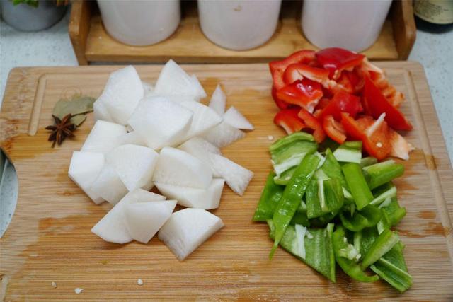 2、白萝卜香菇清洗干净简单,刮掉萝卜皮后做好切成滚刀块,青椒和红椒清洗干净斜刀切成菱形片,再炒鸡丁准备2片香叶、一个八角,鸡胸肉炒什么好吃又简单,鸡胸肉炒什么配菜好吃。