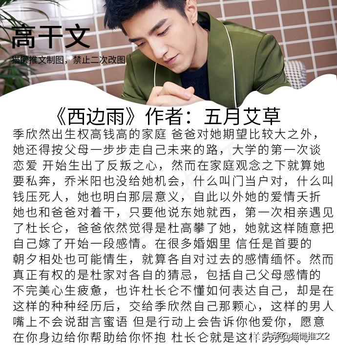 《西边雨》作者:五月艾草简评:女主季欣然交往了一个男朋友,带回家后父亲不同意他们恋爱,与父亲大吵一架后季欣然还是和男友分了手到郊区的一所学校当语文老师,后来接受了母亲安排的相亲。第一次相亲见面的对象是一个公务员叫杜长仑,温文尔雅的性格让季欣然没有排斥的接受这个人,两人步入了婚姻的殿堂,杜长仑对季欣然很是温柔与包容,两人很快培养出了感情,却在感情升温,家庭和睦的时候,两人以前没处理好的过往却又在此时浮出水面。