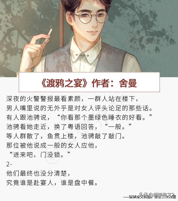 《渡鸭之宴》作者:舍曼简评:女主和交往三年的男友因为抵不住现实的冲击而分手,在报名的雅思的培训班里认识了痞帅的男主池骋。男主看到女主后开始跟她搭话,女主明白男主的意图,两人开始互撩,谁也没有付出多少真心,却也这样牵牵绊绊的度过了一个考试期。考试结束后女主成功考过出国,男主没有考过,两人就此分道扬镳。然而两人又在国外的大学相遇,别后相逢。