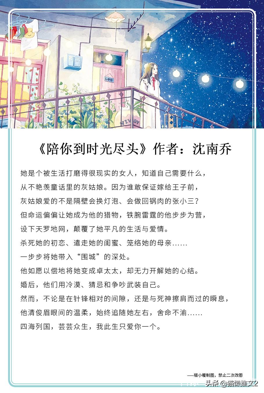 《陪你到时光尽头》作者:沈南乔简评:女主孙菀陪室友厉娅参加一个主题是“钓金龟婿”的酒会,男主卓临城在聚会上对孙菀一见钟情,便用“厉娅男友”的假身份接近孙菀,不料,却被聪明的孙菀在各种细节中发现他的目标是自己。而在命运的安排中,与孙菀相恋的男友萧寻和朋友厉娅都因为卓临城的原因离开了孙菀,所以孙菀十分的仇恨卓临城,即使在卓临城和自己的母亲算计下,孙菀嫁给了卓临城,孙菀也十分怨恨的用冷暴力来对待自己的婚姻。她本以为自己的一辈子就要这样在恨意里度过,却在卓临城的付出和包容里对他也产生了感情。