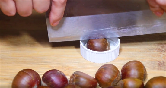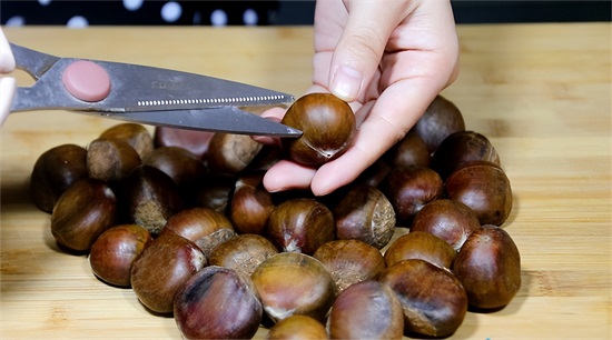 1. 首先准备一把剪刀,在板栗圆的这一面,剪上两刀,也就是划上十字刀。如果不想用剪刀剪,就找一个瓶盖,将板栗放在里面,直接用菜刀切口,这样板栗不会乱动,比较安全。不管是用剪刀还是菜刀,都十分的简单,只要将板栗的背部划开一个口子就行了。用这个办法将所有的板栗都划开口子。