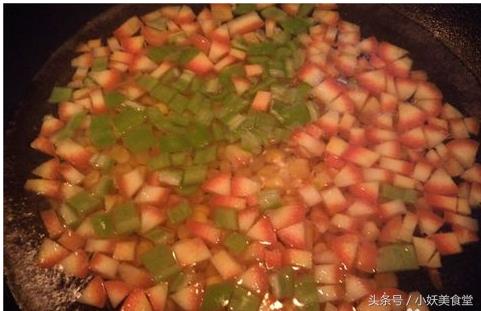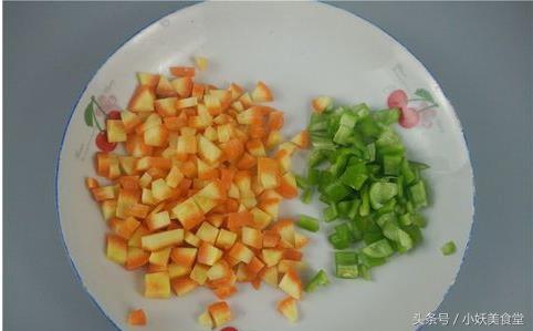 切好胡萝卜丁和柿子椒丁,