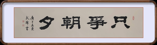 本书法采用仿古宣纸书写,尺幅为95X53厘米。同时,还把“只争朝夕”和“不负韶华”作为两幅单独的书法,用四尺条仿古描龙宣纸书写了一遍。现一并发出来,就像母亲带着她的一对“龙凤胎”一起亮相一样!