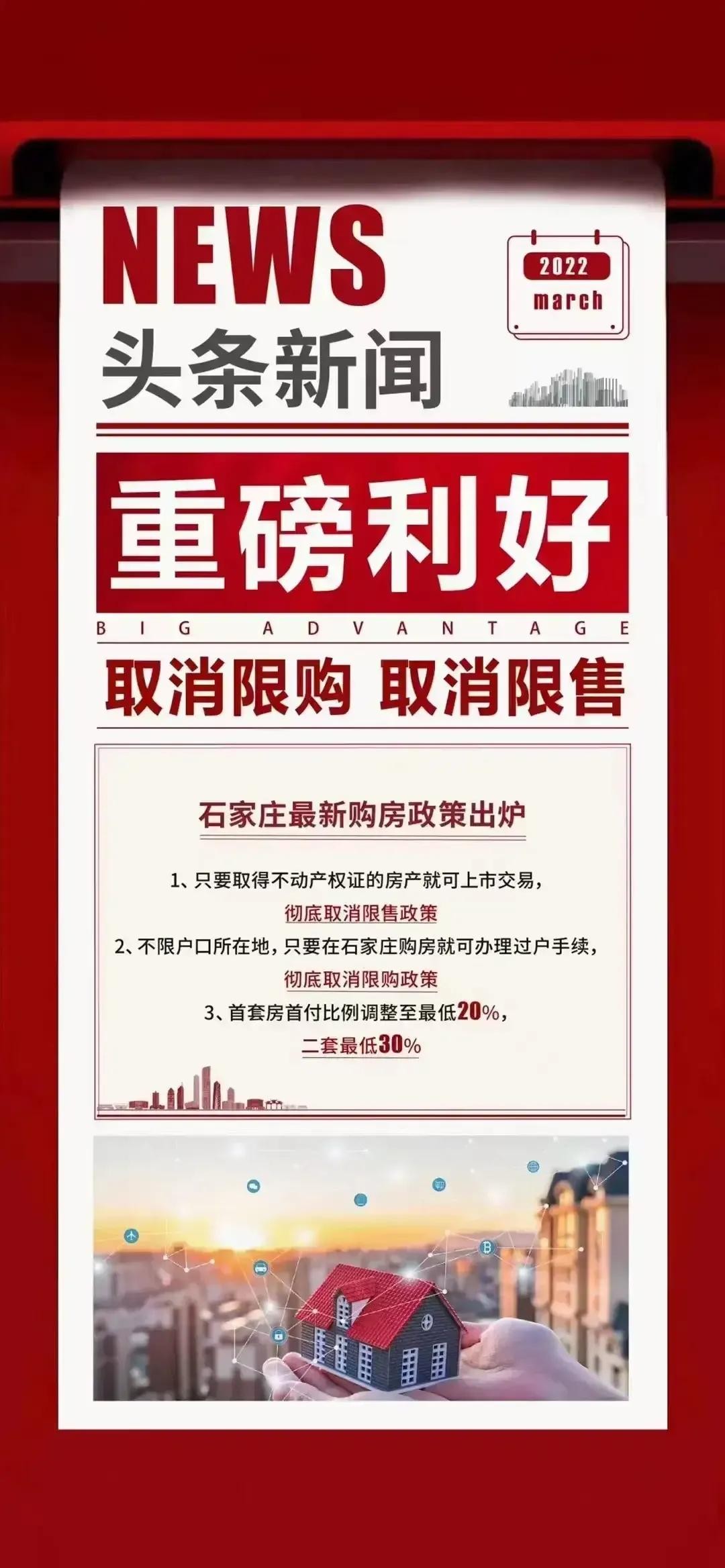 1、石家庄楼市将全面取消限购、限售政策: