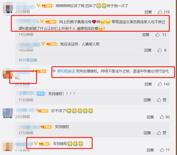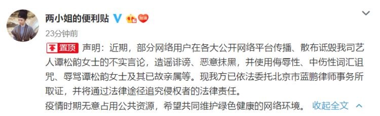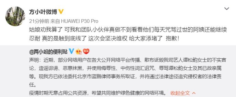 在2月9日,谭松韵工作室发布一则声明,表示最近一段时间有黑粉在网络平台用各种侮辱性词汇攻击谭松韵,造谣诽谤、恶意抹黑甚至还咒骂谭松韵已经去世的母亲,对此,谭松韵方已经对相关网络用户提起了诉讼,追究对方法律责任。随后谭松韵经纪人也发文表示,谭松韵一直在劝和,但自己和团队看到对方咒骂已经去世的阿姨,实在触及到底线了,因此要坚决维权。