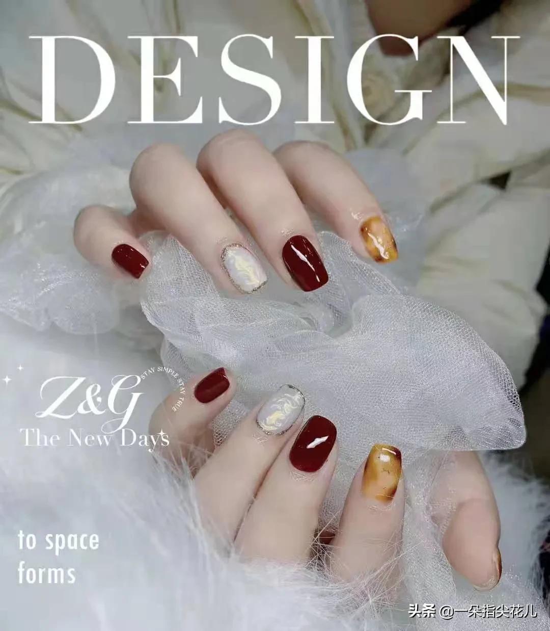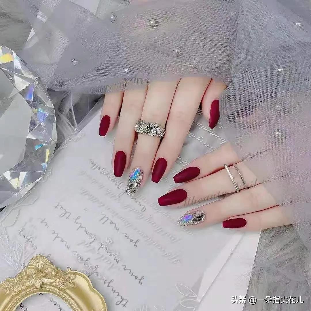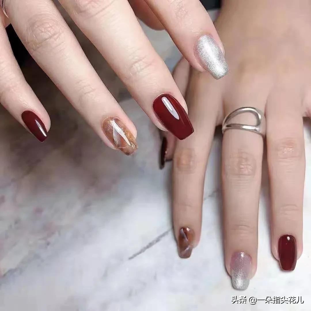 第一款:酒红色+晶石猫眼银色+理石晕染。这是一款非常女人味,成熟有韵味。