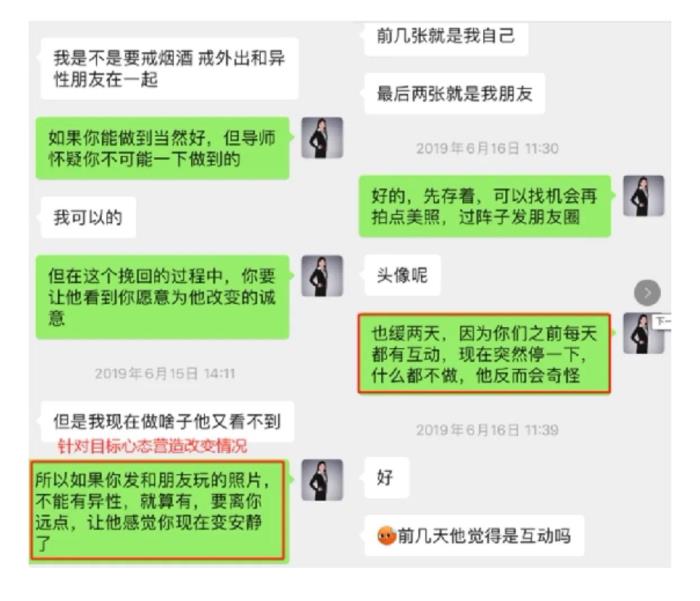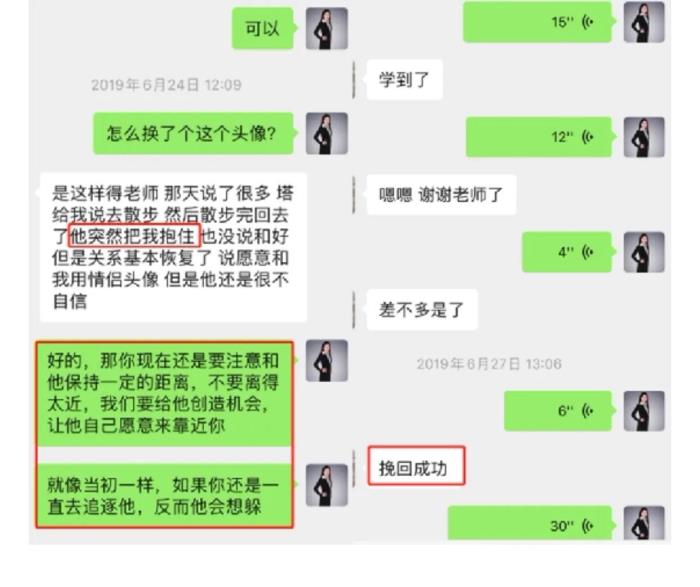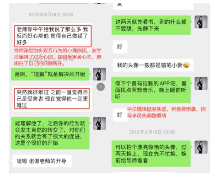 在挽回的过程中,导师指导学员针对目标的心理特征进行行为策略,手把手指导操作,方法正确了,目标对象很快有了回应。但是学员由于急于快速达成目标而患得患失产生焦虑,导师针对双方性格特征,进行心理分析,使学员清晰思路。