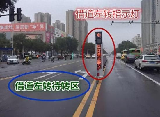 解释一下,借道左转就是专门为左转车辆新开辟的一条车道,驾驶员可以借助对向车道来进行左转,加大道路使用率从而减轻交通拥堵,简单的说就是把其中一条对向车道,临时充当左转道来使用。