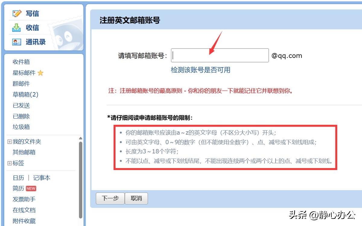 阅读申请邮箱账号的限制条件,在邮箱账号编辑框中输入想要设置的英文邮箱账号,并检测该账号是否可用。经检测可用后,可点击【下一步】按钮。