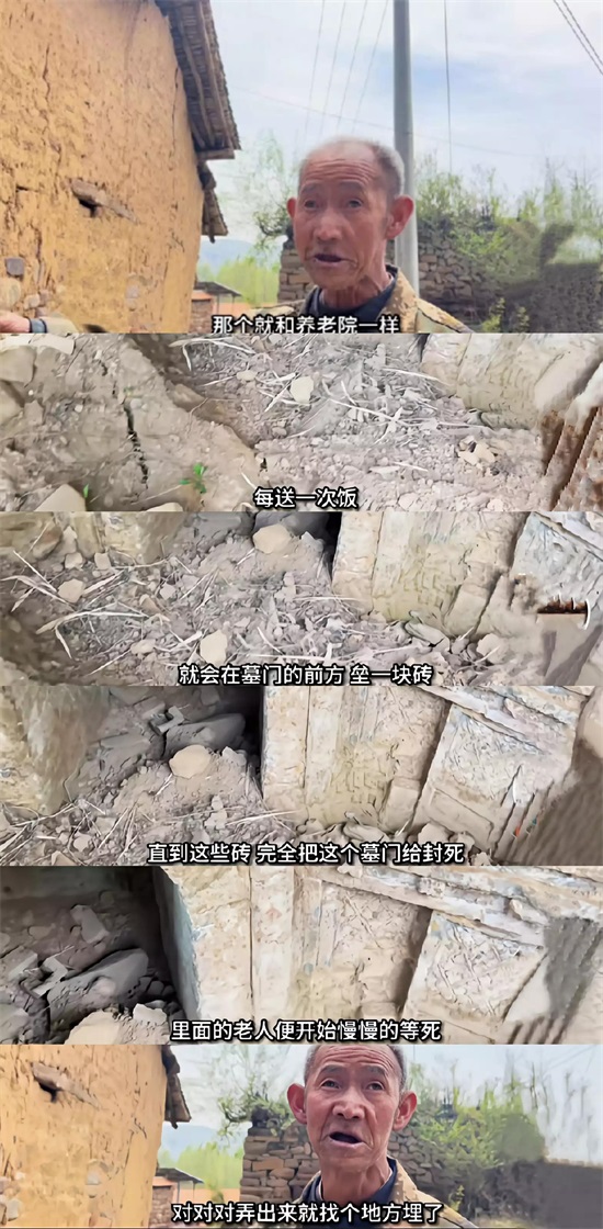 不过刚开始时,老人在墓里时,家人还是会每天送一顿饭给老人食用,而每送一次饭,就外在洞口堵上一块砖,直至最后一次送饭,将最后的一块砖完全将洞口封闭以后,就再也不送饭了,因为老人巳完全被砖头封在墓穴里等死!