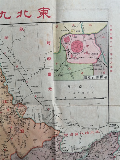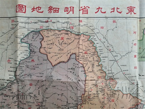 一面为民国三十六年十月的《东北九省明细地图》。1945年抗战胜利后,中华民国政府在东北地区划分为九个省,分别为辽宁省、安东省、辽北省、吉林省、松江省、合江省、黑龙江省、嫩江省、兴安省。另还设有三个直辖市,直属于行政院,分别是沈阳市、大连市和哈尔滨市。
