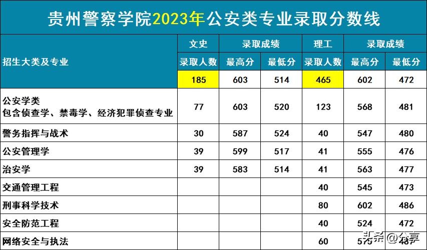 二、2023年贵州警察学院公安类专业,分文史和理工2个科类招录,录取总人数650人;其中理工有8个招录专业(类), 录取465人;文史类有4个招录专业(类),录取185人;