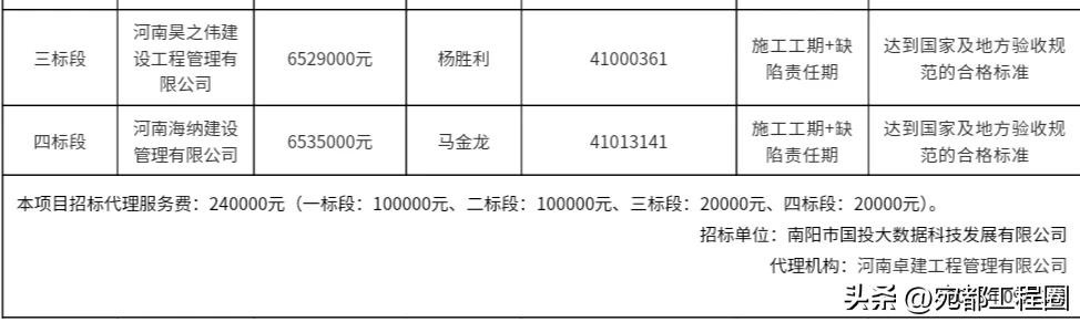 第三标段中标人为河南昊之伟建设工程管理有限公司,中标金额为6529000元。工期为施工工期+缺陷责任期。第四标段中标人为河南海纳建设管理有限公司,中标金额为6535000元。工期为施工工期+缺陷责任期。