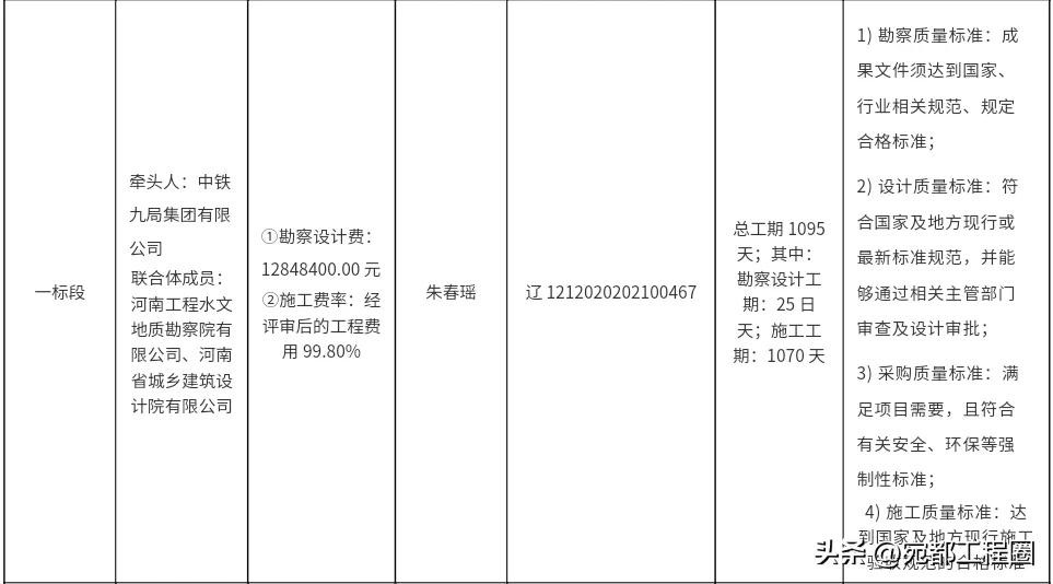 根据中标信息公告显示,本次中标项目共分为四个标段,第一标段中标人为联合体中标,牵头人为中铁九局集团有限公司。联合体成员包括,河南工程水文地质勘察院有限公司,河南省城乡建筑设计院有限公司。中标金额分别为,勘察设计费为12848400.00 元,施工费率为经评审后的工程费用 99.80%。总工期为 1095 天;其中,勘察设计工期25 天,施工工期1070 天。