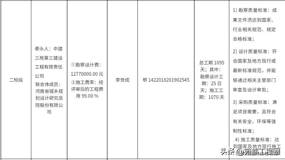 第二标段中标人也为联合体中标。牵头人为中建三局第三建设工程有限责任公司,联合体成员包括,河南省城乡规划设计研究总院股份有限公司。中标金额分别为,勘察设计费为12770000.00 元,施工费率为经评审后的工程费用 99.00 %。总工期为 1095 天,其中,勘察设计工期25 天,施工工期1070 天。