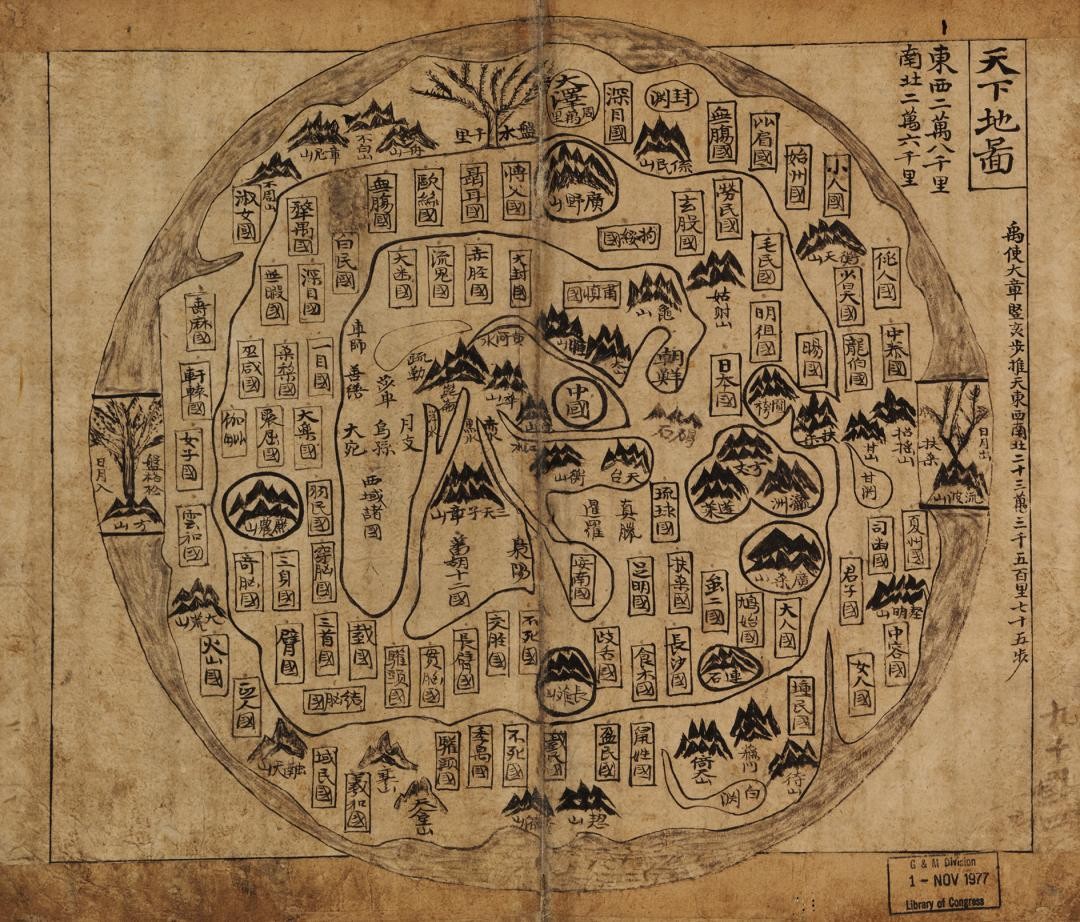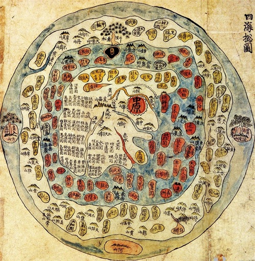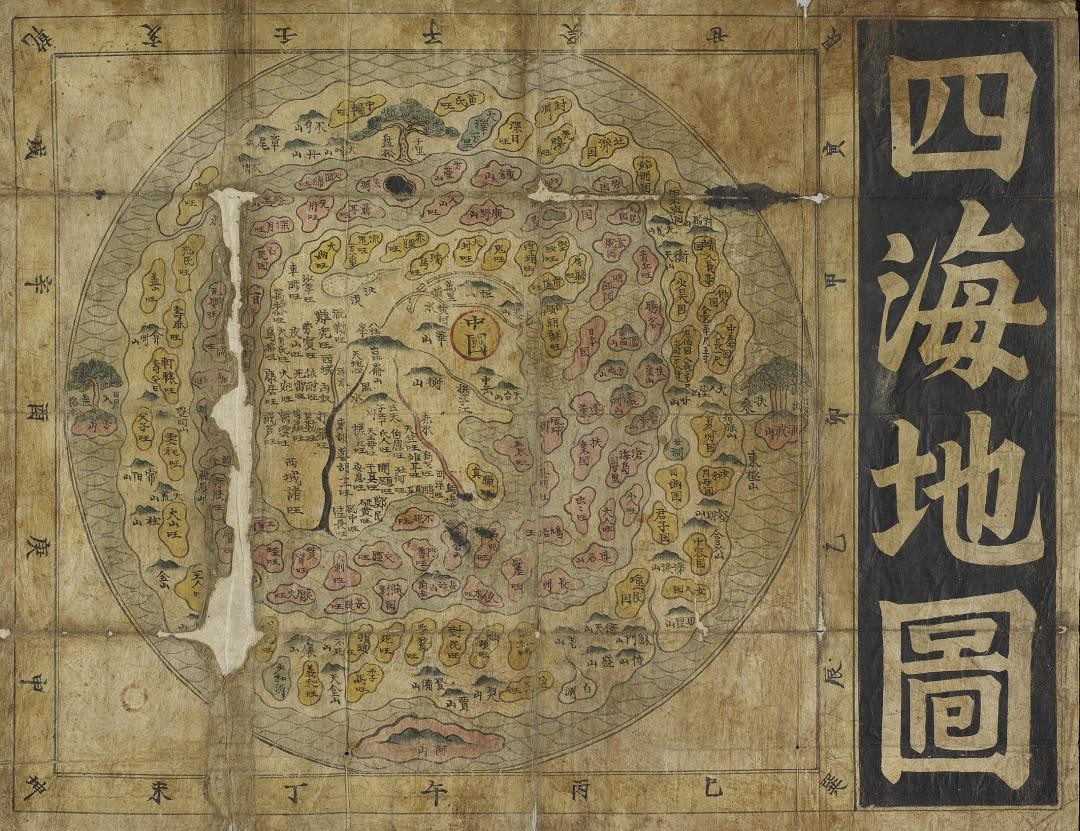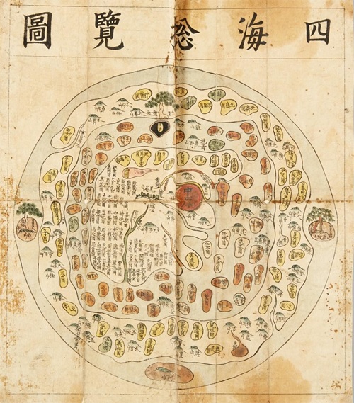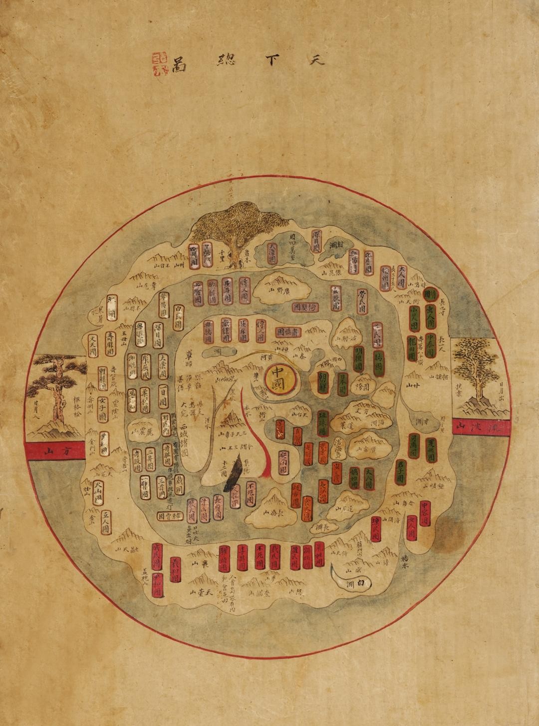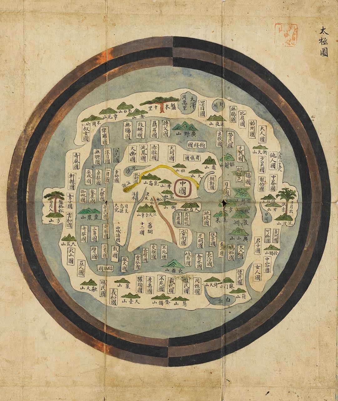 刊刻于朝鲜的一系列圆形地图,多冠以《四海总图》《天下总图》等名目,时间约从十六世纪晚期到十八世纪,其形式大体相似,或许来自一个更为古老的母本。以中原大陆居中,长江、黄河及长城的标志极为夸张,泰山、天台山等名山的位置也做了放大。中原大陆周围被大海环绕,海中有密集的岛屿。