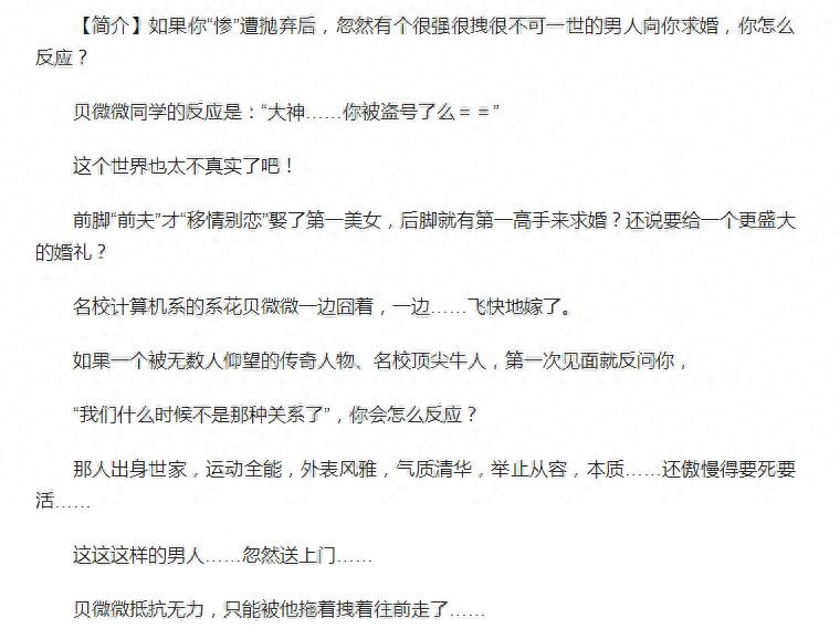 这本小说同样是小编的网游类小说入坑之作,《全职高手》都尚且要晚一点。虽然一开始就“被三”“被离婚”这个梗老套了点,但是爽啊!有什么比渣男小三被打脸更爽的剧情?如果有,那就是连环打脸!乖乖女贝微微,学霸一枚,大神级操作,遇上了另一位全服第一的大佬,这个大佬还是学神师兄。俩人没有狗血的误会,也没有为虐而虐,全程就负责苏苏苏、甜甜甜!这样的糖度绝对满足小可爱们的少女心!