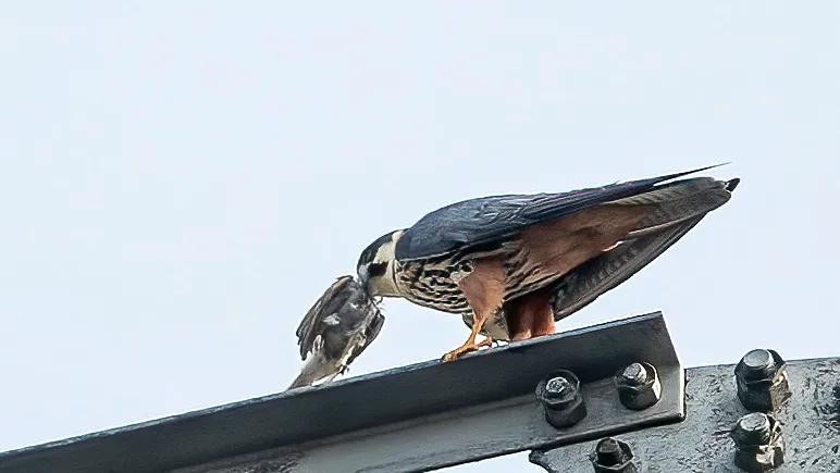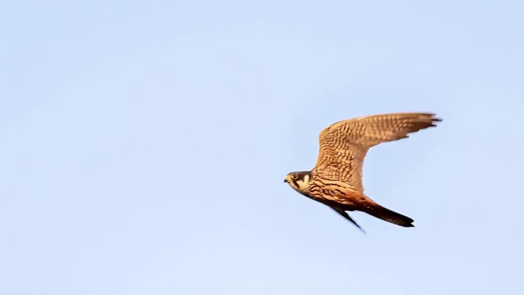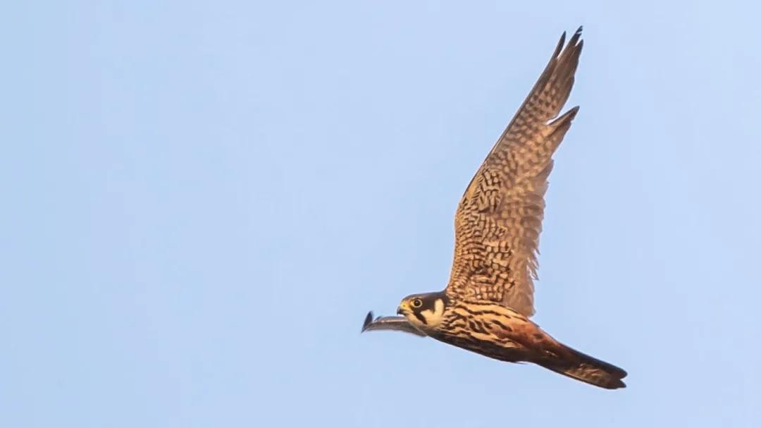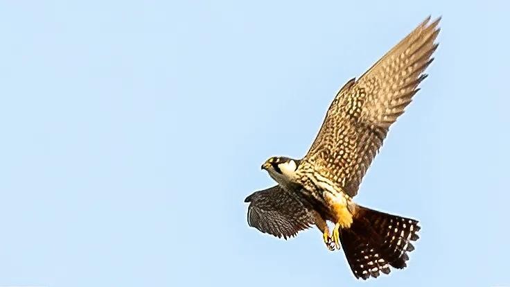 燕隼:体形比猎隼、游隼等都小,为小型猛禽,上体深蓝褐色,下体白色,具暗色条纹。腿羽淡红色。繁殖于欧洲、非洲西北部、俄罗斯等,越冬于日本、印度、老挝、缅甸等地,在中国分布几乎遍及全国各地。栖息于接近林地的开阔原野。捕食小鸟和大型昆虫。近似种有非洲燕隼、东非的燕隼、东南亚和南太平洋的东方燕隼,中国国家二级重点保护野生动物。