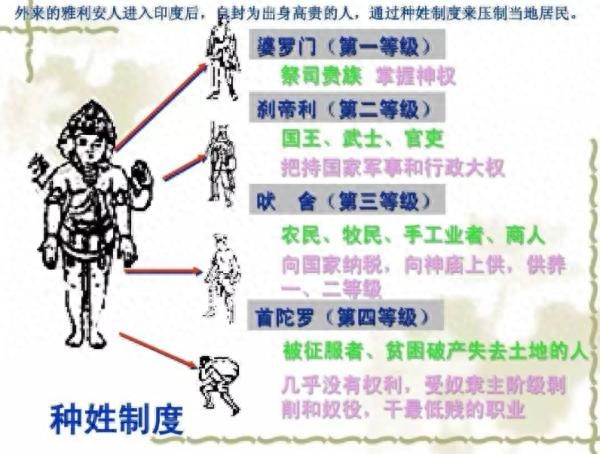 印度种姓制度又称瓦尔纳制度是在后期吠陀时代形成的。它是古代世界最典型、最森严的等级制度。四个等级在地位、权利、职业、义务等方面有严格的规定: